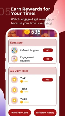 1. Ad Rewards: Watch ads and earn coins effortlessly. 2. Engagement Rewards: Earn coins for every view, like, dislike, or comment on reels. 3. Referral Rewards: Invite friends and earn even more!